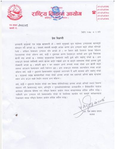 राष्ट्रिय किसान आयोगले बाढी र डुबानबाट प्रभावित किसानलाई राहत, क्षतिपूर्ति र पुनःस्थापनाका कार्यक्रम अबिलम्ब घोषणा गर्न सरकारसमक्ष आग्रह गरेको छ । आयोगले वर्षा, बाढी र डुबानबाट धानबालीमा भएको क्षतिको यथार्थ विवरण संकलन गरी किसानलाई राहत, क्षतिपूर्ति र पुनःस्थापनाका अल्पकालीन र दीर्घकालीन प्याकेजका कार्यक्रम ल्याउन सरकारसमक्ष आग्रह गरेको हो ।