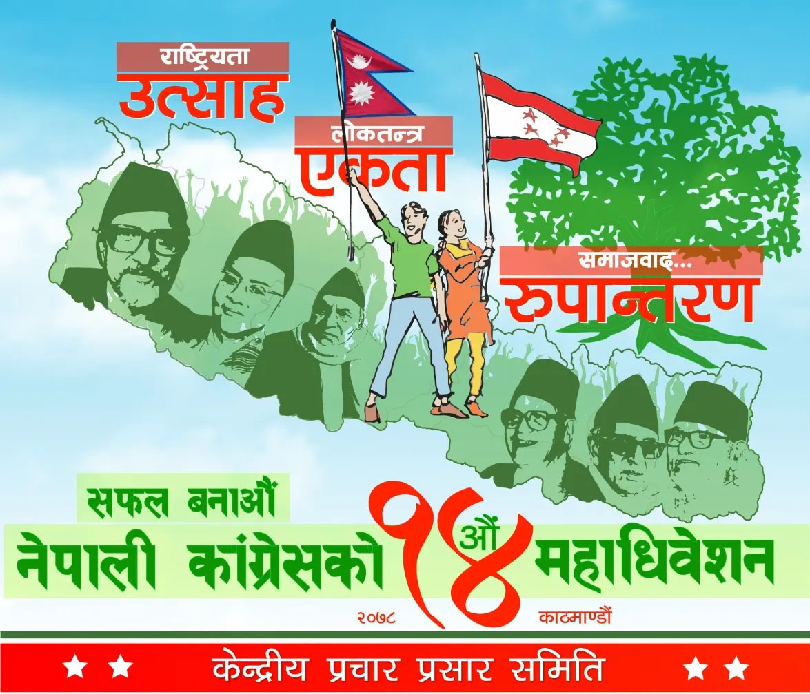 ब्यानरमा नेपालको नक्साभित्र दुई युवाले नेपालको झण्डा र कांग्रेसको झण्डा बोकेको, चुनाव चिह्न रुख तथा बिपी कोइरालालगायतका अग्रज नेतृत्वको तस्वीर अङ्कित छ । सो प्रचार ब्यानरको छोटो भिडियो भने दुई दिनपछि सार्वजनिक गरिने समितिले जनाएको छ । कांग्रेसको १४औँ महाधिवेशन यही मङ्सिर २४ देखि २६ गतेसम्म काठमाडौँमा हुँदैछ ।