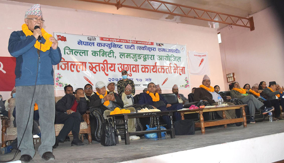 लमजुङ, १७ पुस । पूर्वप्रधानमन्त्री तथा नेपाल कम्युनिष्ट पार्टी (एकीकृत समाजवादी)का अध्यक्ष माधवकुमार नेपालले मुलुक समृद्ध बनाउनका लागि आफ्नो पार्टी समाजवाद लक्ष्यका साथ अघि बढिरहेको बताउनुभएको छ । आज लमजुङ बेँसीशहर नगरपालिका–८ मा नेकपा (एकीकृत समाजवादी) जिल्ला कमिटी लमजुङद्वारा आयोजित जिल्लास्तरीय अगुवा कार्यकर्ता भेलालाई सम्बोधन गर्नुहुँदै उहाँले असल भावनासहित समृद्धिको यात्रामा अघि विश्वास दिलाउनुभयो । उहाँले जनताको जीवन खुशी र सुखी बनाउने लक्ष्यका चाँडै पूरा हुने दाबी गर्नुभयो ।