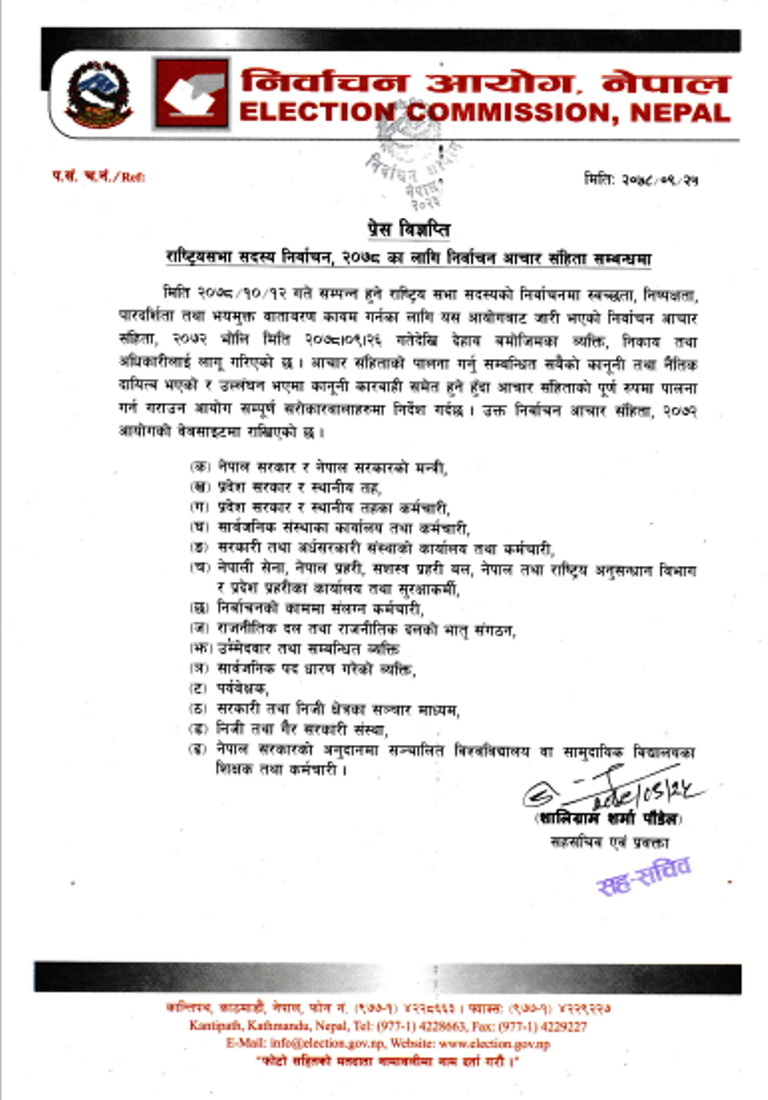 निर्वाचनमा स्वच्छता, निष्पक्षता, पारदर्शिता तथा भयमुक्त वातावरण कायम गर्नका लागिे निर्वाचन आचारसंहिता, २०७२ सोमबार (२६ पुस)बाट लागु हुने आयोगले जनाएको छ ।