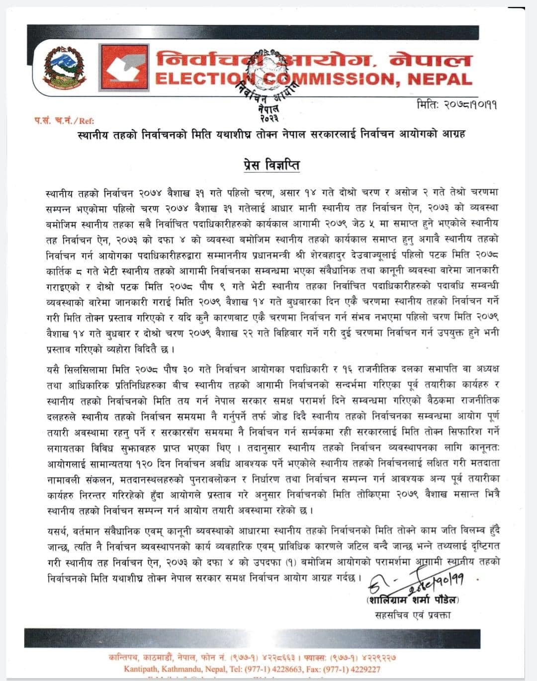आयोगका प्रवक्ता शालिग्राम शर्मा पौडेलले आज विज्ञप्ति निकालेर आयोगको परामर्शमा सरकारले स्थानीय तह निर्वाचनको मिति तोक्नुपर्ने उल्लेख गरेका छन्।