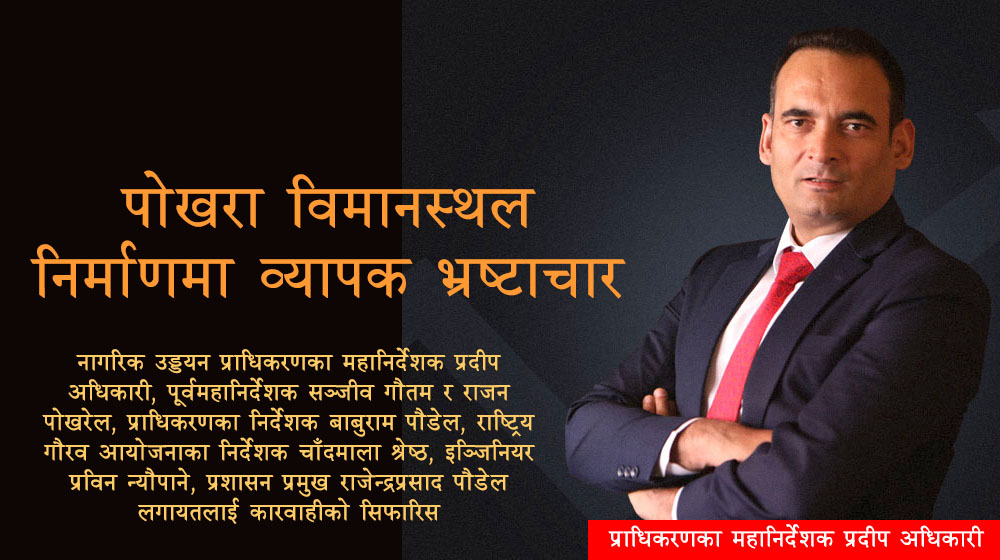 नेपाल नागरिक उड्डयन प्राधिकरणमा हालका महानिर्देशक नै पोखरा अन्तर्राष्ट्रिय विमानस्थलको आयोजना प्रमुख रहेको भन्दै प्राधिकरणका महानिर्देशक प्रदीप अधिकारीलाई तत्काल निलम्बन गरी अनुसन्धान अघि बढाउन सिफारिस