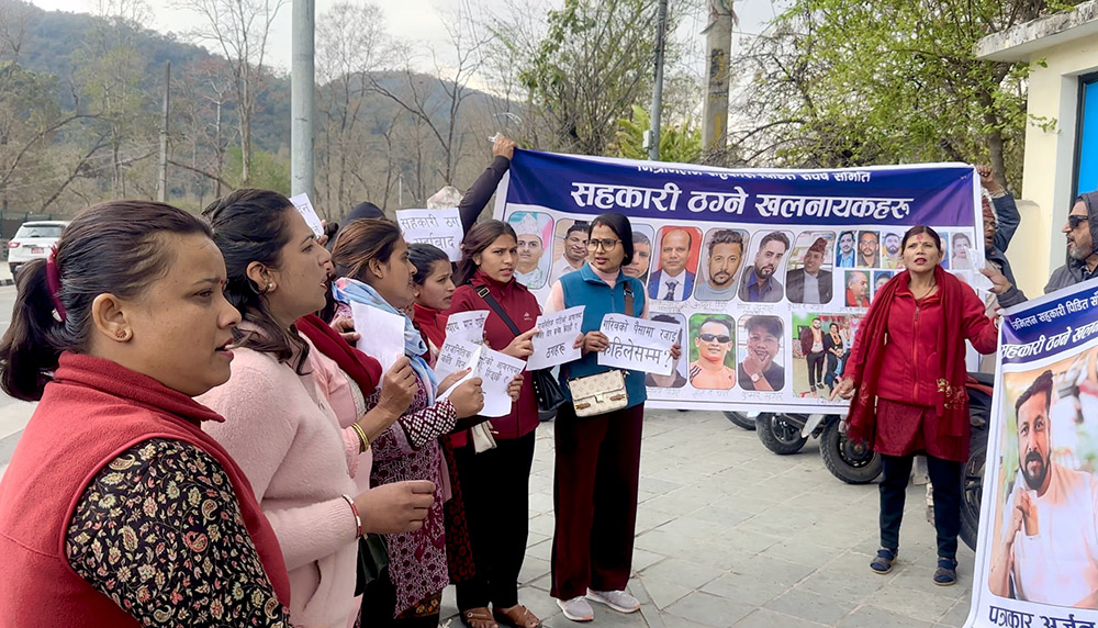 नेकपा एमालेका नेता एवम् पत्रकार अर्जुन गिरी, कानुनी व्यवसायी जनकल्याण पराजुली, पत्रकार विजय लम्सालसहितका टोले गुन्डाहरु मिलेर लुटिएको मित्र मिलन सहकारीका पीडितहरु न्यायालय अगाडि नाराबाजी गर्दै । फाईल तस्विर ।
