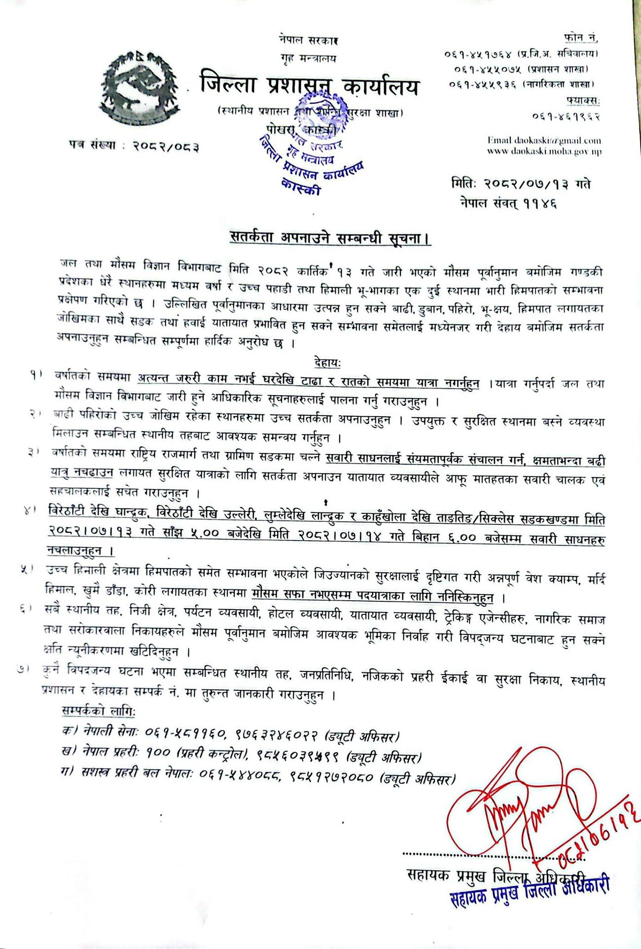 बिहीबार जारी सार्वजनिक सूचनामा जल तथा मौसम विज्ञान विभागको पूर्वानुमानलाई आधार मान्दै गण्डकी प्रदेशमा मध्यमदेखि भारी वर्षा तथा हिमपात हुने प्रक्षेपण गरिएको उल्लेख छ। यसै सन्दर्भमा अन्नपूर्ण आधार शिविर, मर्दी हिमाल आधार शिविर, मोडल माछापुच्छ्रे ट्रेक, कपुचे पदयात्रा र खुमईलगायतका लोकप्रिय हिमाली मार्गमा यात्रा नगर्न तथा अत्यधिक सतर्कता अपनाउन प्रशासनले निर्देशन दिएको सहायक प्रमुख जिल्ला अधिकारी शिवप्रसाद लम्सालले जानकारी दिए।