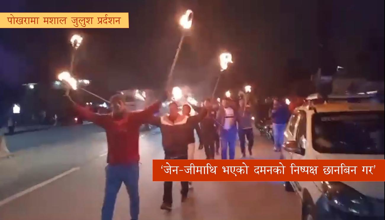 १जेन–जीमाथि भएको दमनको निष्पक्ष छानबिनको माग गर्दै पोखरामा मशाल जुलुश प्रदर्शन