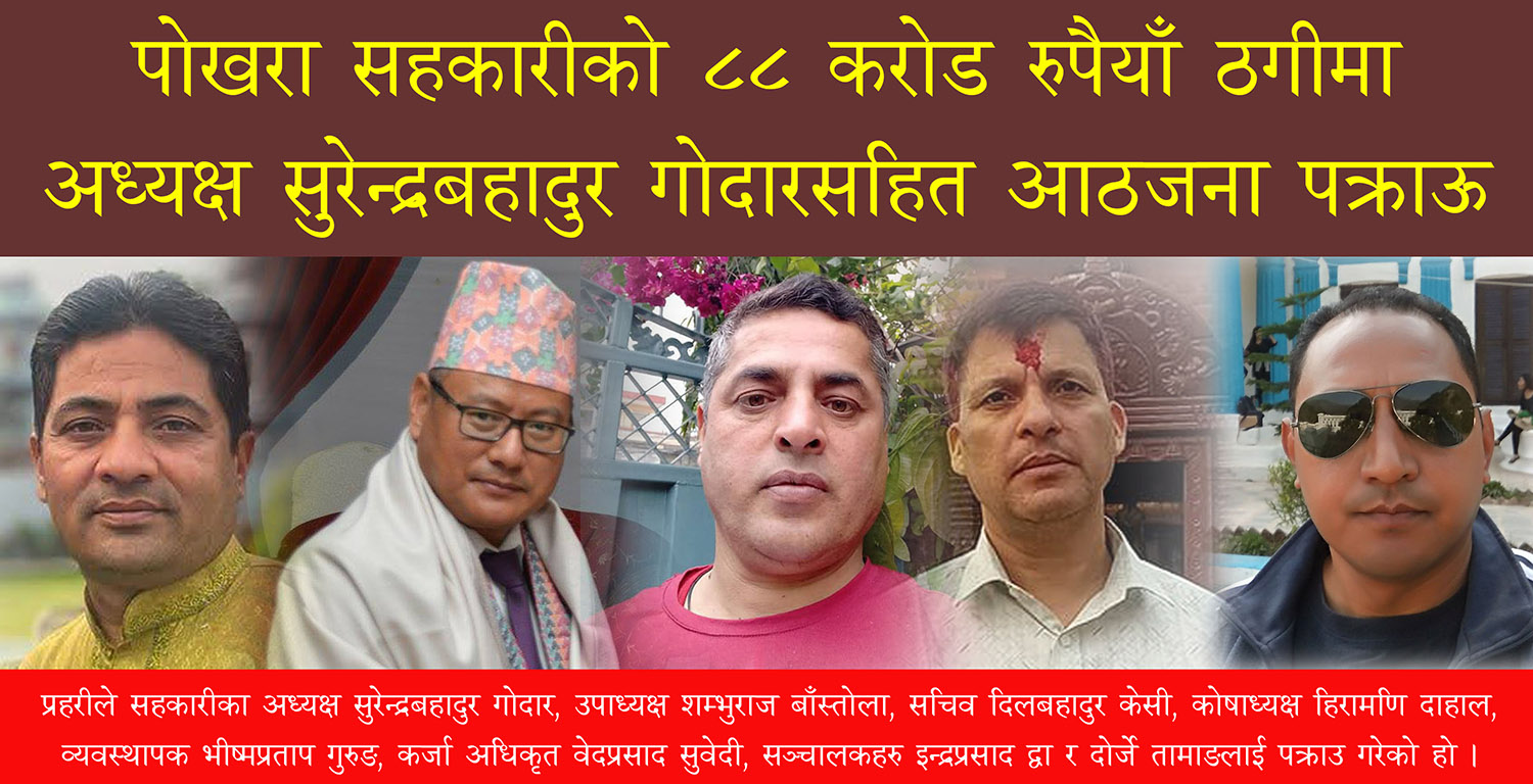 पोखरा, १९ कार्तिक । पोखरा बचत तथा ऋण सहकारी संस्था लिमिटेडको झण्डैं ८८ करोड रुपैयाँ ठगी गरेको आरोपमा अध्यक्ष सुरेन्द्रबहादुर गोदारसहित आठ जनालाई जिल्ला प्रहरी कार्यालय कास्कीले आज बुधबार पक्राउ गरेको छ । यो गिरोहले सहकारीको ८८ करोड ७० लाख ९८ हजार ९ सय ६२ रुपैयाँ ठगी गरेको जिल्ला प्रहरी कार्यालय कास्कीले जानकारी दिएको छ ।
