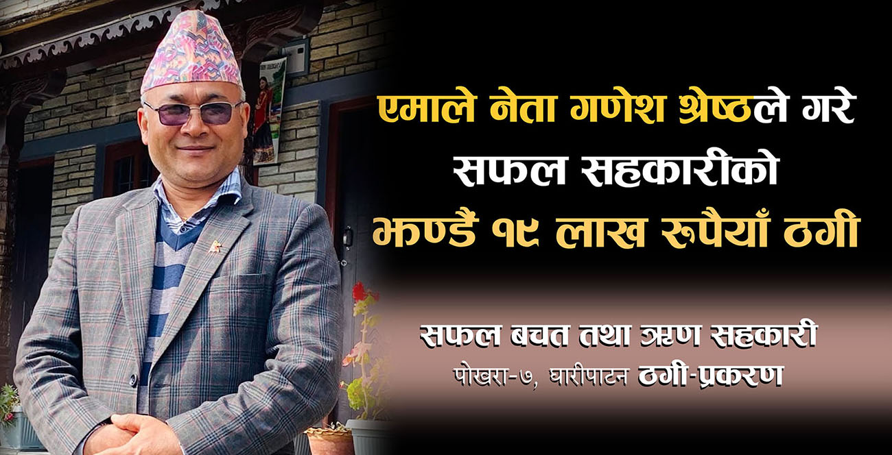 पोखरा, २ मंसिर । पोखरा–७ घारीपाटनमा सञ्चालित सफल बचत तथा ऋण सहकारी संस्थाका तत्कालीन अध्यक्ष तथा नेकपा (एमाले)का नेता गणेश श्रेष्ठले १८ लाख ८५ हजार २८४ रुपैयाँ ठगी गरेको प्रारम्भिक अनुसन्धानबाट पुष्टि भएको छ । मुख्यतः महिला बचतकर्ताहरूको बाहुल्य रहेको यो सहकारीमा श्रेष्ठले विगत पाँच वर्षदेखि ऋण वितरण र ब्याजमा चलखेल गरी लाखौं रुपैयाँ ठगी गरेको आरोप लागेको हो ।