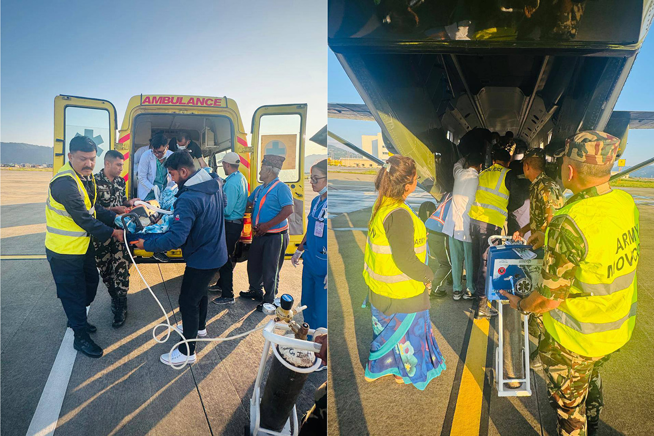 घाइते लक्ष्मण नेपालीलाई थप उपचारका लागि काठमाडौं पठाउँदैं प्रजिअ रुद्रादेवी शर्मा र कास्की प्रहरी प्रमुख एसपी नविन कार्कीसहित सुरक्षा निकायको टोली । फाईल तस्विर