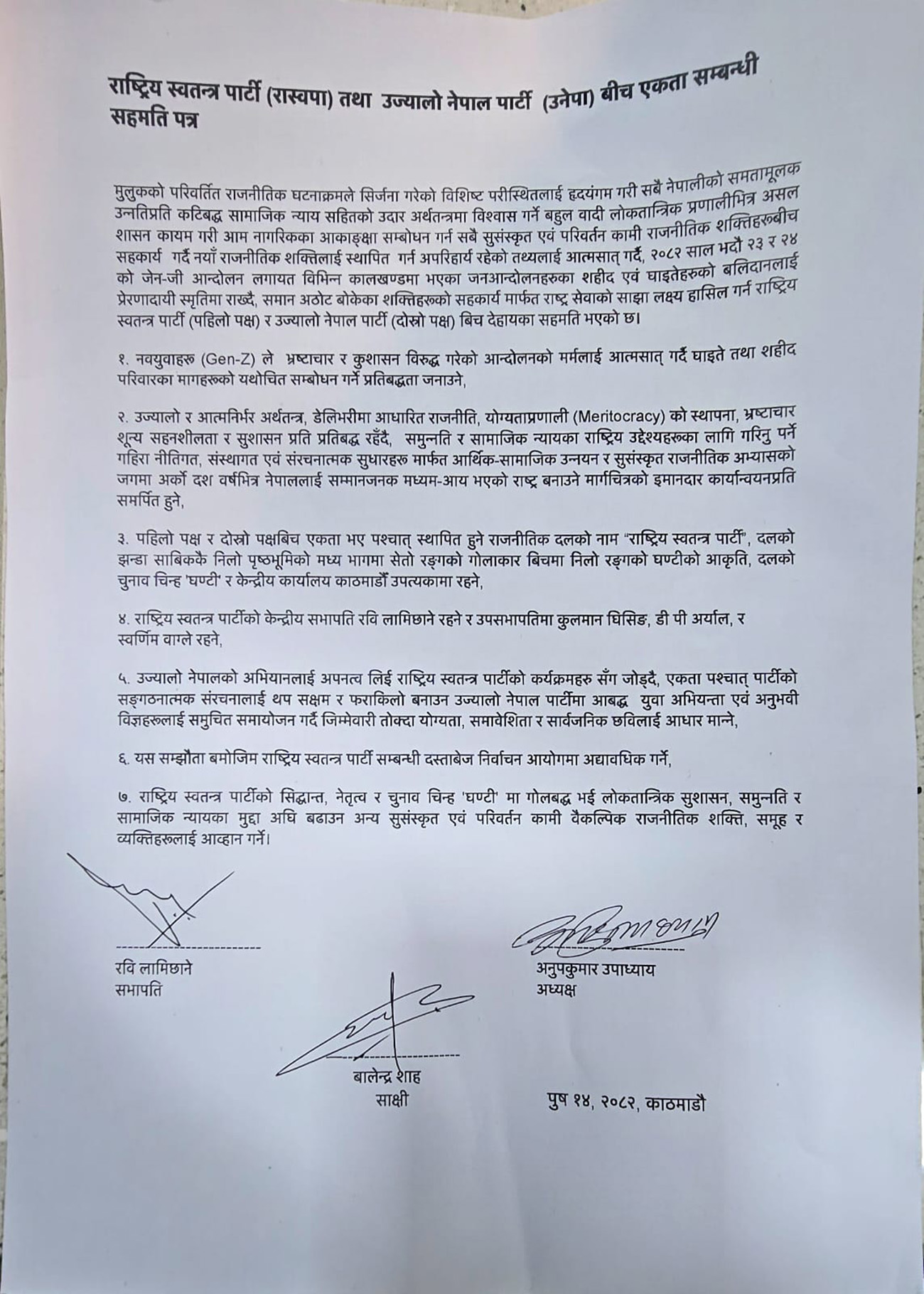 १रास्वपा र उज्यालो नेपाल पार्टीबीच एकीकरण