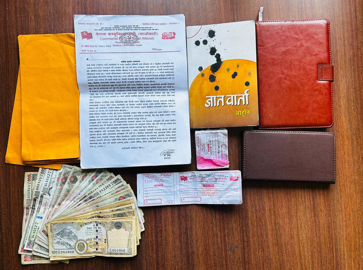उनीहरूको साथबाट प्रहरीले नेपाल कम्युनिस्ट पार्टी (माओवादी) गण्डक ब्यूरो लेखिएको रसिदको ठेली (रसिद नम्बर १४२१ देखि १४४० सम्म, जसमध्ये १५ थान अर्धकट्टी विभिन्न व्यक्ति तथा संघसंस्थाको नाममा काटिएका), नेपाल कम्युनिस्ट पार्टी (माओवादी) जिल्ला समिति कास्कीको आर्थिक सहयोगसम्बन्धी पत्र (सेक्रेटरी क. वृन्दाको हस्ताक्षर भएको २० थान), पहेँलो रंगको खाली खाम १५ थान, नगद २३ हजार रुपैयाँ, ‘जातवार्ता आहुति’ लेखिएको पुस्तक १ थान, खैरो रंगको डायरी २ थान र मोबाइल ३ थान बरामद गरेको छ।