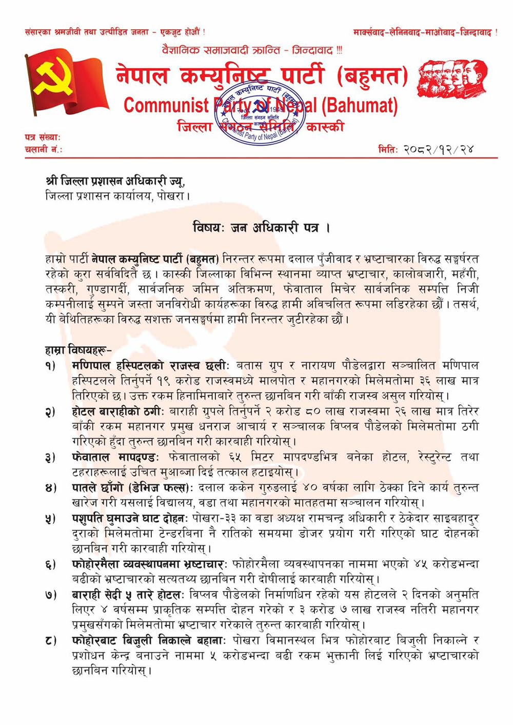 पार्टीले उक्त पत्रमा कास्कीका सेक्रेटरी एल.बी. सुजनले कास्की जिल्लामा व्याप्त भ्रष्टाचार, कालोबजारी, महँगी, तस्करी, गुण्डागर्दी तथा सार्वजनिक सम्पत्तिको दोहन रोक्न र जनविरोधी कार्यहरूविरुद्ध सशक्त कारबाही गर्न माग गरेका छन् । पार्टीले आफू निरन्तर दलाल पुँजीवाद र भ्रष्टाचारविरुद्ध संघर्षरत रहेको उल्लेख गर्दै यी बेथितिविरुद्ध जनसङ्घर्षमा जुटीरहेको जनाएको छ ।