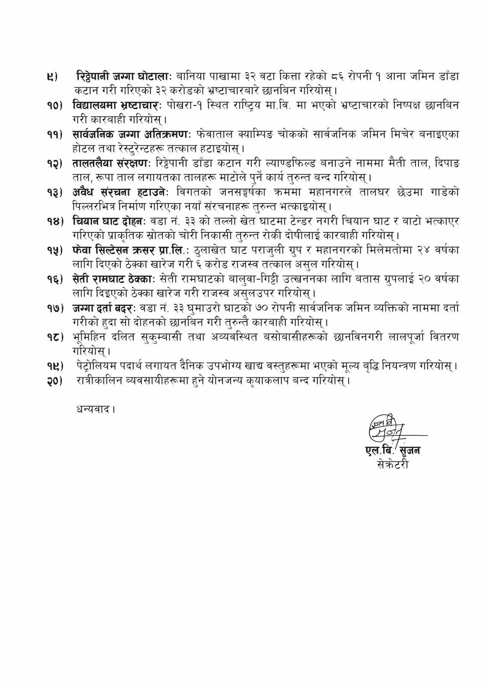 वडा नं ३३ घुमाउरो घाटको ७० रोपनी सार्वजनिक जमिन व्यक्तिको नाममा दर्ता गरिएको घटनाको छानबिन गरी तुरुन्त कारबाही गर्नुपर्ने, भूमिहीन दलित, सुकुम्बासी तथा अव्यवस्थित बसोबासीहरूको छानबिन गरी लालपूर्जा वितरण गर्नुपर्ने माग पनि जनअधिकारी पत्रमा उल्लेख छ ।
