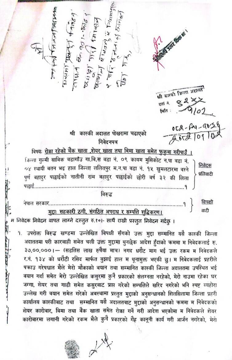 पोखरा, ५ वैशाख । जिल्ला अदालत कास्कीमा सहकारी ठगीमा संलग्न भएर धरौंटीमा रिहा भएकाहरुले धमाधम रोक्का बैंक खाता र सम्पत्ति फुकुवाको माग गर्दै कानुनी प्रक्रिया अघि बढाईरहँदा पीडितहरु झनैं अन्यायमा पर्ने देखिएको छ । बचतकर्ताको बचत सुनिश्चिता नगर्दै अदालतमा अर्को खेल सुरु हुन थालेको छ ।
