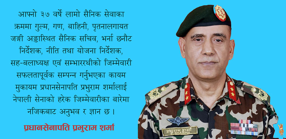 काठमाडौँ, ११ भदौ । राष्ट्रपति विद्यादेवी भण्डारीले बलाधिकृत रथी प्रभुराम शर्मालाई यही भदौ २४ गतेदेखि लागू हुने गरी नेपाली सेनाको प्रधानसेनापतिमा नियुक्त गर्नुभएको छ ।