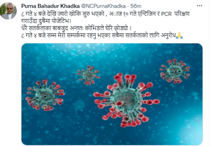काठमाडौं । नेपाली कांग्रेसका महामन्त्री पूर्णबहादुर खड्कालाई कोरोना संक्रमण पुष्टि भएको छ । आइतबार गरिएको एन्टिजेन र पीसीआर परीक्षणमा आफूमा कोरोना पोजेटिभ पुष्टि भएको सामाजिक सञ्जाल ट्वीटरमार्फत खड्काले जानकारी दिएका छन् ।