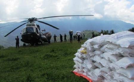 हेलिकप्टरबाट पुर्‍याइयो उत्तरी गोरखामा खाद्यान्न