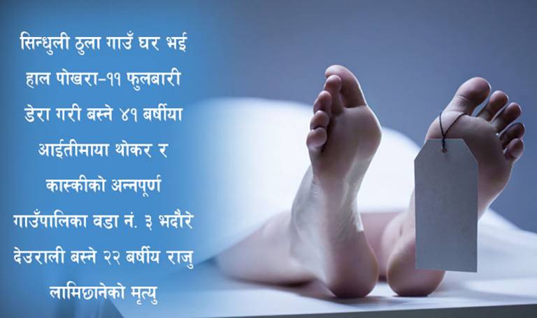 पोखरा, ९ कार्तिक । पोखरामा दुई छुट्टा–छुट्टै घटनामा परेर दुईजनाको मृत्यु भएको छ । आज पोखरा वडा नं. ११ काहुँडाडा लामिछाने थरस्थित निर्माणाधिन घरको जगको खाल्डोमा सोलिङ गर्ने क्रममा विहान […]