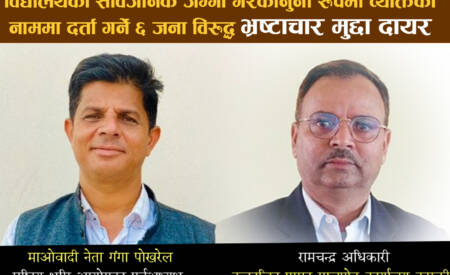 पोखरा, १६ पुस । अख्तियार दुरुपयोग अनुसन्धान आयोगले पोखरा महानगरपालिका–२६ स्थित अमर ज्योति आधारभूत विद्यालयको सार्वजनिक जग्गा गैरकानुनी रूपमा व्यक्तिको नाममा दर्ता गरेको आरोपमा राष्ट्रिय भूमि आयोग कास्कीका तत्कालीन अध्यक्ष […]
