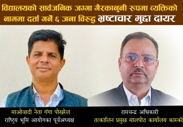 पोखरा, १६ पुस । अख्तियार दुरुपयोग अनुसन्धान आयोगले पोखरा महानगरपालिका–२६ स्थित अमर ज्योति आधारभूत विद्यालयको सार्वजनिक जग्गा गैरकानुनी रूपमा व्यक्तिको नाममा दर्ता गरेको आरोपमा राष्ट्रिय भूमि आयोग कास्कीका तत्कालीन अध्यक्ष […]