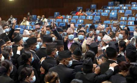 काठमाडौँ । प्रतिनिधिसभाको आजको बैठक पनि प्रमुख प्रतिपक्षी दल नेकपा (एमाले)ले अवरोेधका कायमै राख्दा सुचारु हुनसकेको छैन ।बैठक प्रारम्भ हुनासाथ सदाझैँ प्रतिपक्षी दल एमालेका सांसदले रोष्ट्रम घेराउ गर्दै नाराबाजी गरेका […]