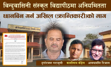अखिल नेपाल राष्ट्रिय स्वतन्त्र विद्यार्थी युनियन (क्रान्तिकारी), विन्दुवासिनी संस्कृत विद्यापीठ क्याम्पस समितिले क्याम्पस प्रशासन र केही प्राध्यापकहरूले गरेको स्वेच्छाचारी व्यवहार, ठगी र अनियमितताको विरोधमा कडा कदम चाल्ने चेतावनी दिएको छ। […]