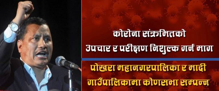 पोखरा । नेत्रविक्रम चन्द ‘विप्लव’ नेतृत्वको नेपाल कम्युनिष्ट पार्टी (नेकपा) कास्कीले कोरोनाको प्रभावले आक्रान्त जनताको स्वास्थ्य जाँच र उपचारको निशुल्क व्यवस्थाको माग गर्दै आज पोखरा महानगरपालिका र मादी गाउँपालिकामा कोणसभा […]