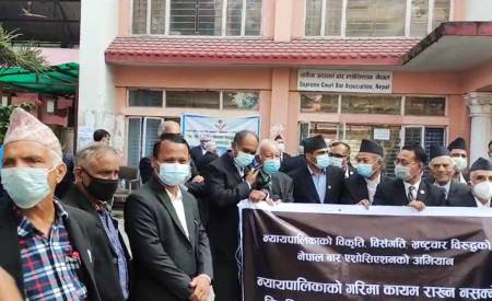 प्रधानन्यायाधीशको राजीनामा माग्दै सर्वोच्चमा बारको धर्ना, वकिलका हातमा कालोपट्टी